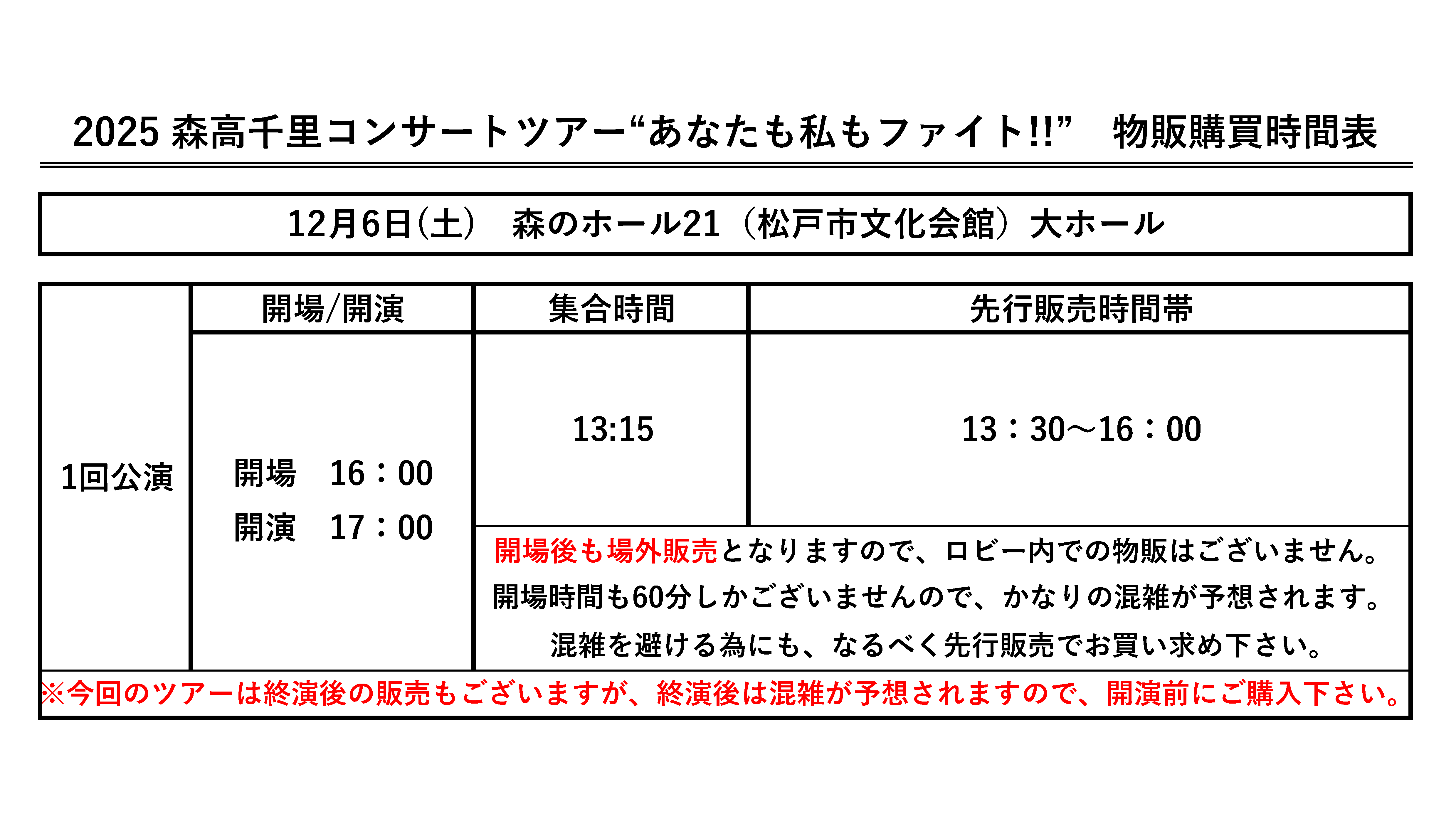 ※先行販売、開場後も場外販売となりますので、ロビー内での物販はございません。