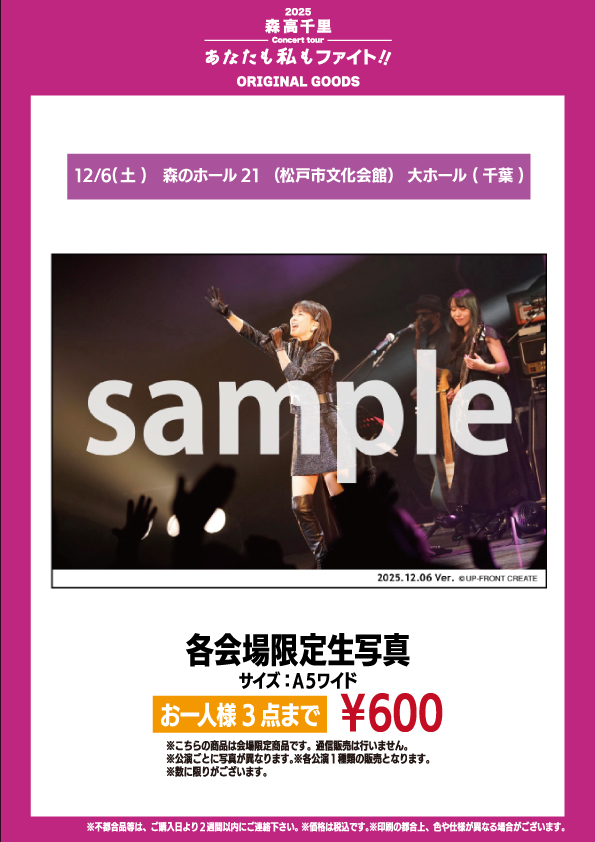 2025 森高千里コンサートツアー“あなたも私もファイト!!” 千葉公演 当日物販及び『日替わり各会場限定生写真』のお知らせ!